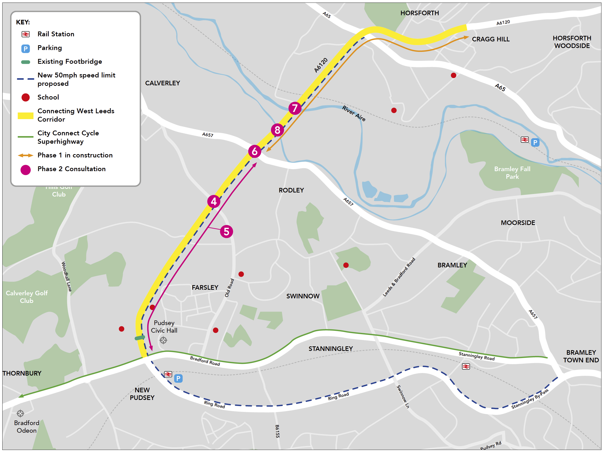 The next proposed package of measures would include; a new walking, wheeling and cycling bridge across the outer ring road connecting the communities of Calverley and Farsley; the creation of a mixed-use path linking Rodley roundabout to Dawsons Corner, traffic light improvements to Rodley roundabout, aiming to ease congestion; safety measures banning right turns out of Calverley Bridge and Calverley Lane North junctions; an accessible ramp that links A6120 outer ring road to Leeds-Liverpool canal towpath, Rodley; and planting and landscaping improvements along the whole route.