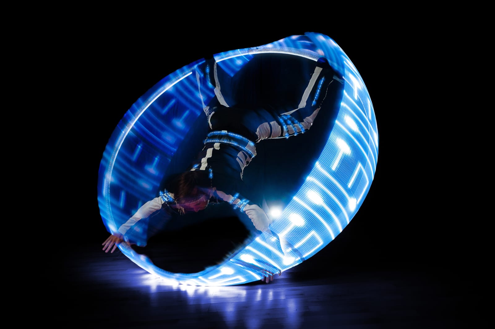 At Trinity Leeds, Yorkshire Circus will present Portals, which features a one-of-a-kind acrobatic performance inside an illuminated wheel.