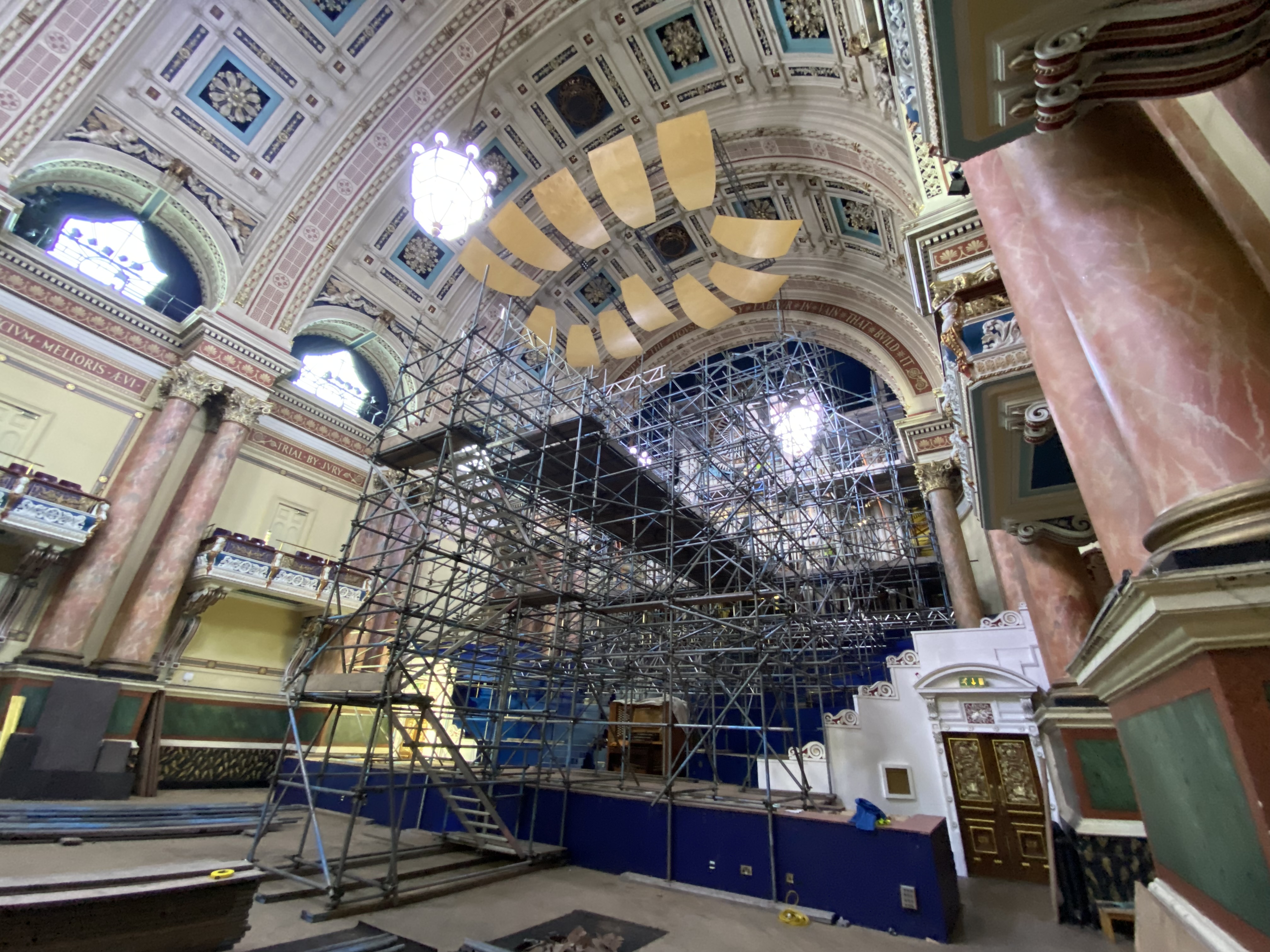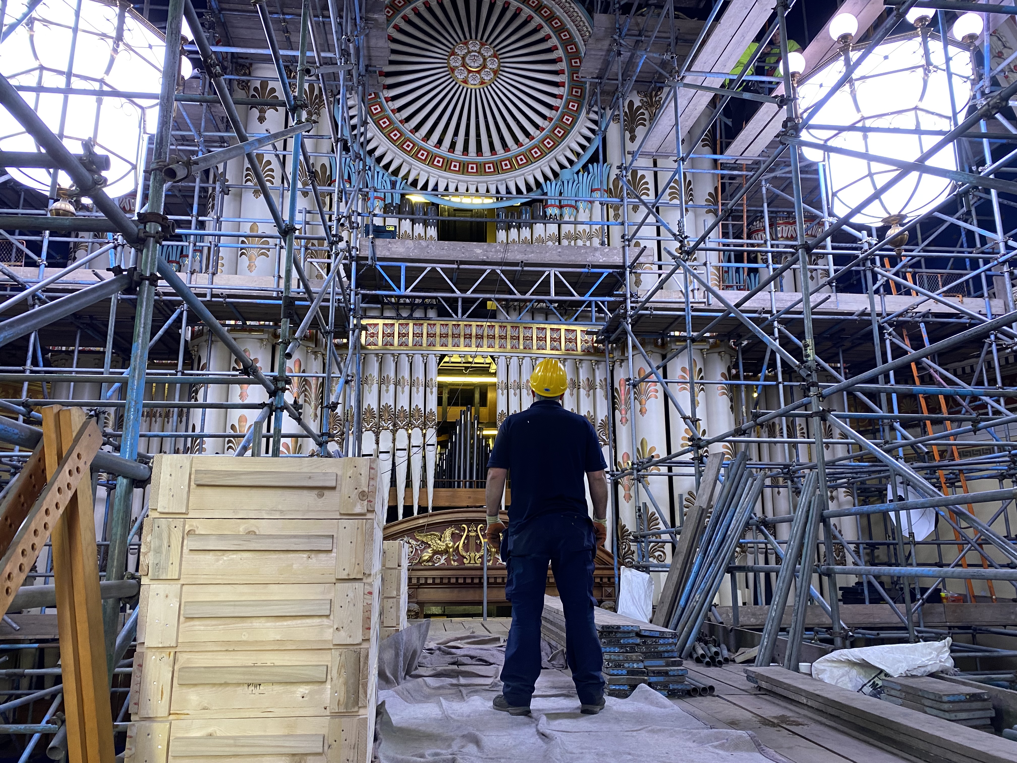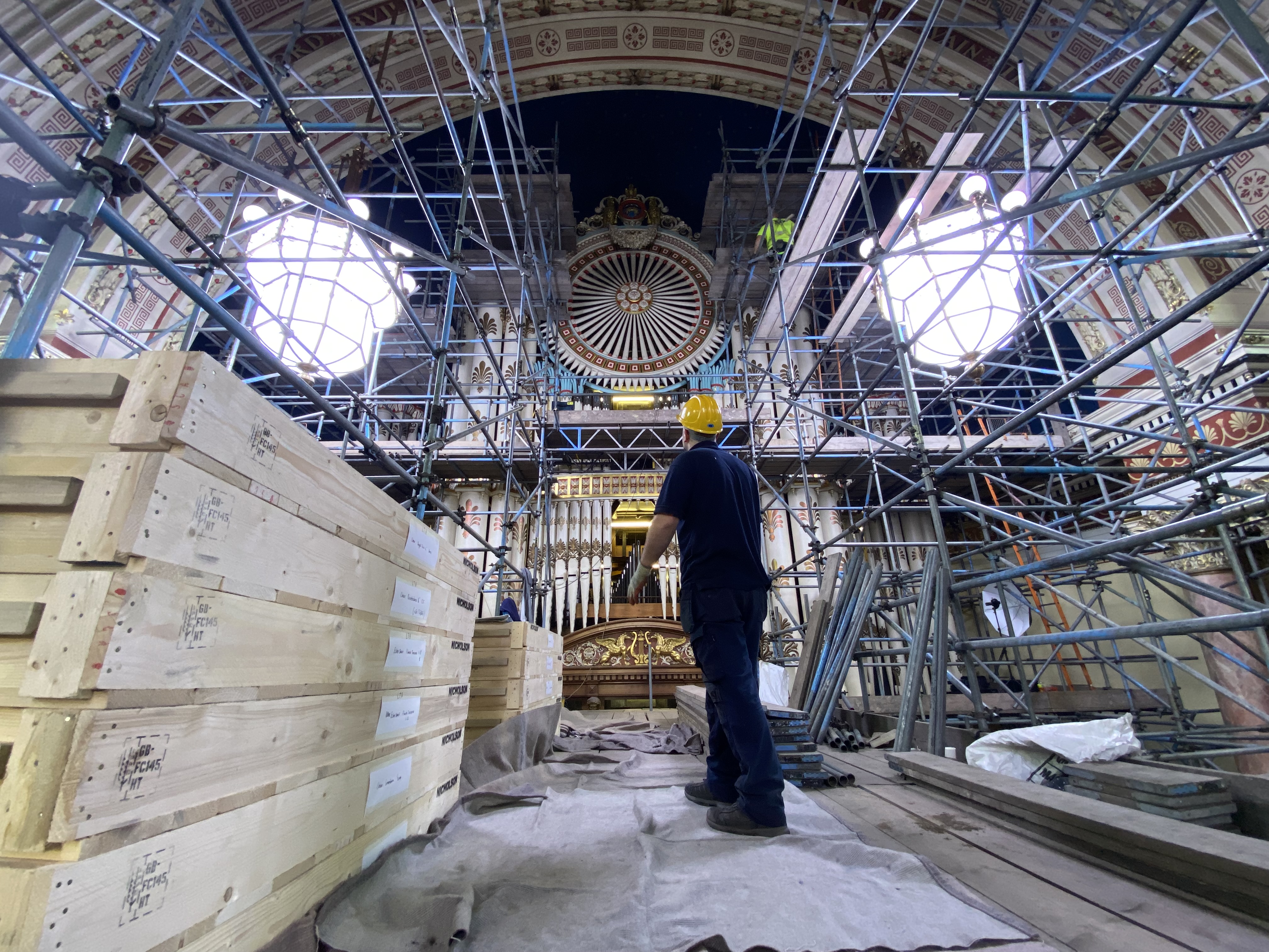 Pipe organ specialists from Nicholson and Co. Ltd set up in the building’s magnificent Victoria Hall this week where they began erecting a complex network of scaffolding around the 50ft high organ before getting to work on the painstaking process of dismantling its impressive pipes and intricate inner workings.