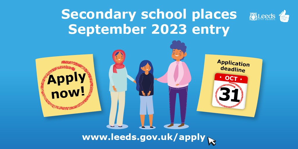 Parents and carers must apply to Leeds City Council by the deadline of Monday 31 October, using the online application form and stating their 5 preferred secondary schools.