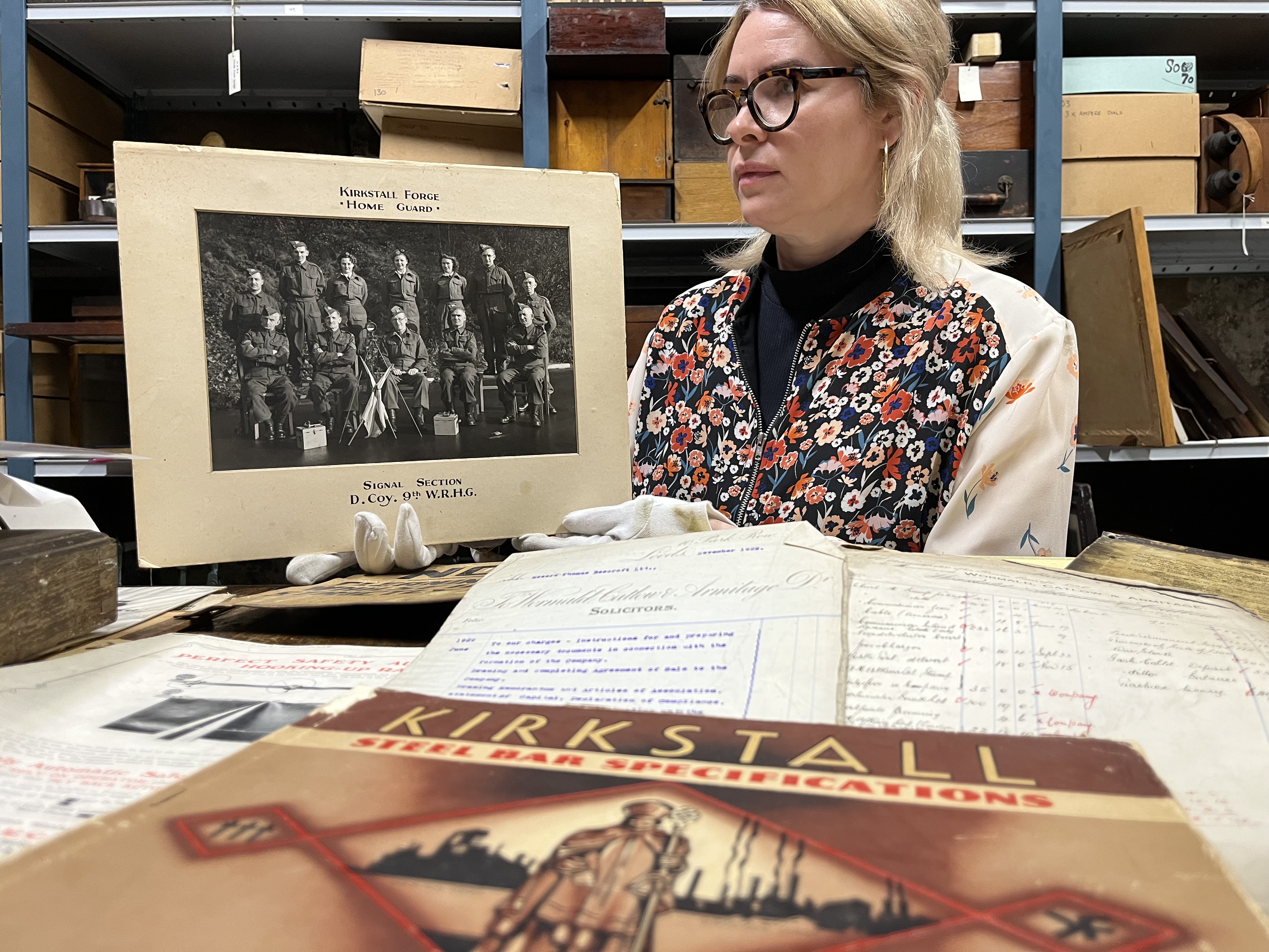 Employee documents, legal papers, factory signs and product catalogues are included alongside a photograph of the Kirkstall Forge Home Guard in full uniform.