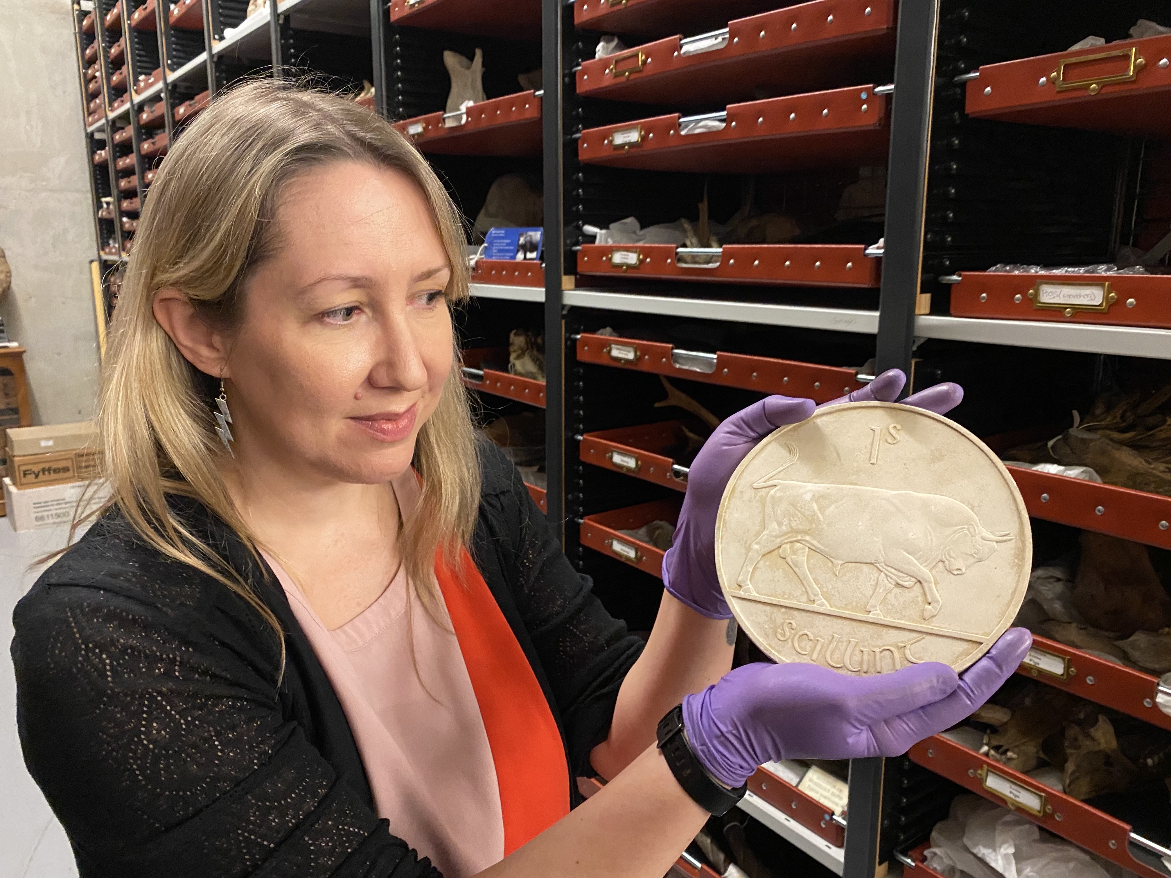 Also on display is a plaster model of a shilling from Ireland, dating from before 1928. The sculptor, Percy Metcalfe, designed the Irish Free State coinage of 1928. Some of his designs featured animals important to Ireland’s economy, such as the bull, hare, salmon and Irish wolfhound.