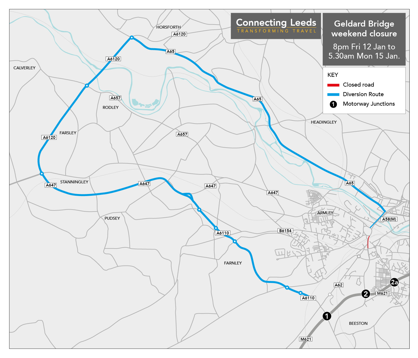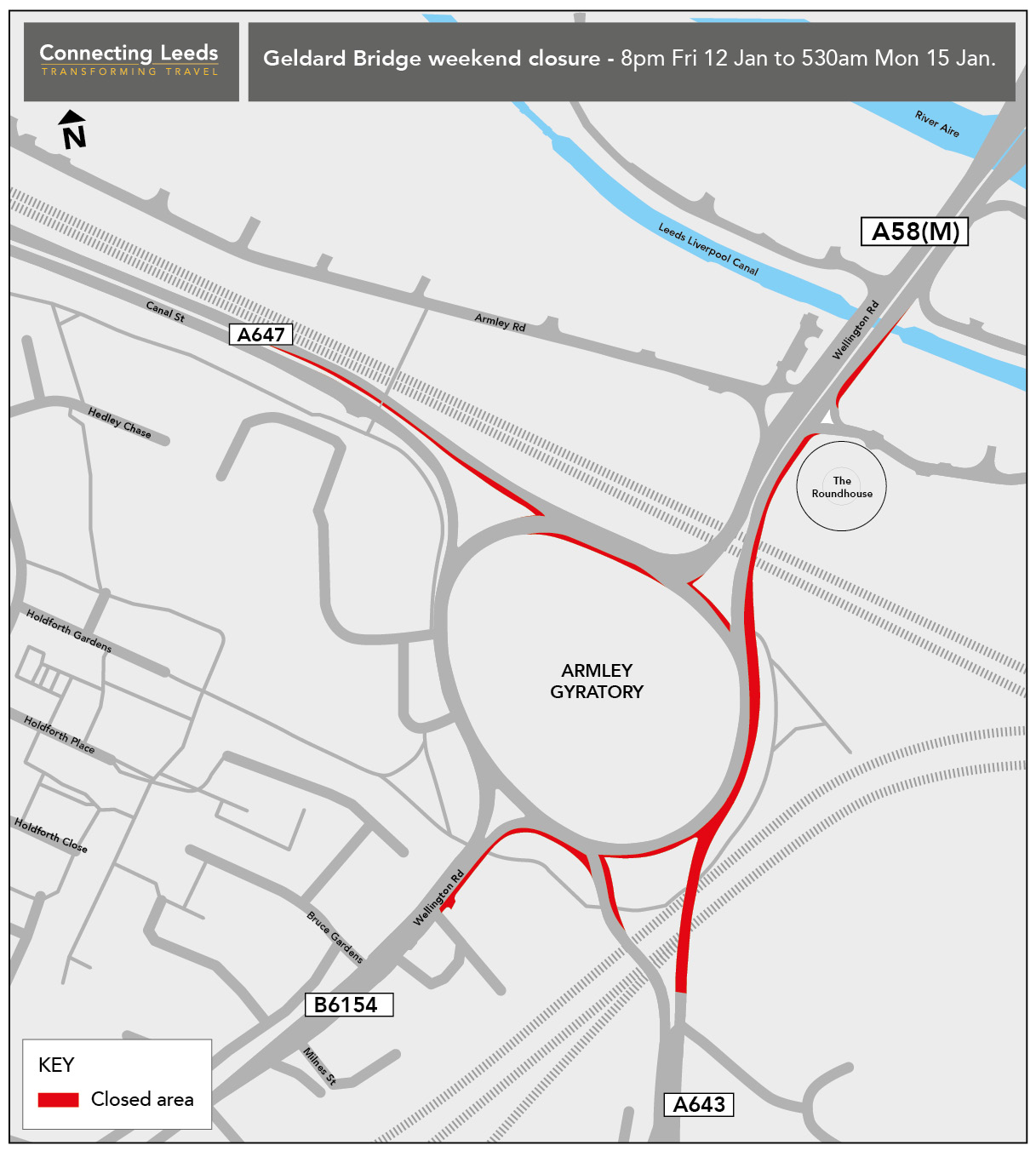 To complete the Gelderd Road bridge work, motorists are advised there will be a weekend partial closure, starting 8pm Friday 12 January, until 530am Monday 15 January. With the Armley Gyratory approach to A58 Wellington Road south east exit closed and Ingram Distributer south bound will be closed, re-opening again outside of these hours.