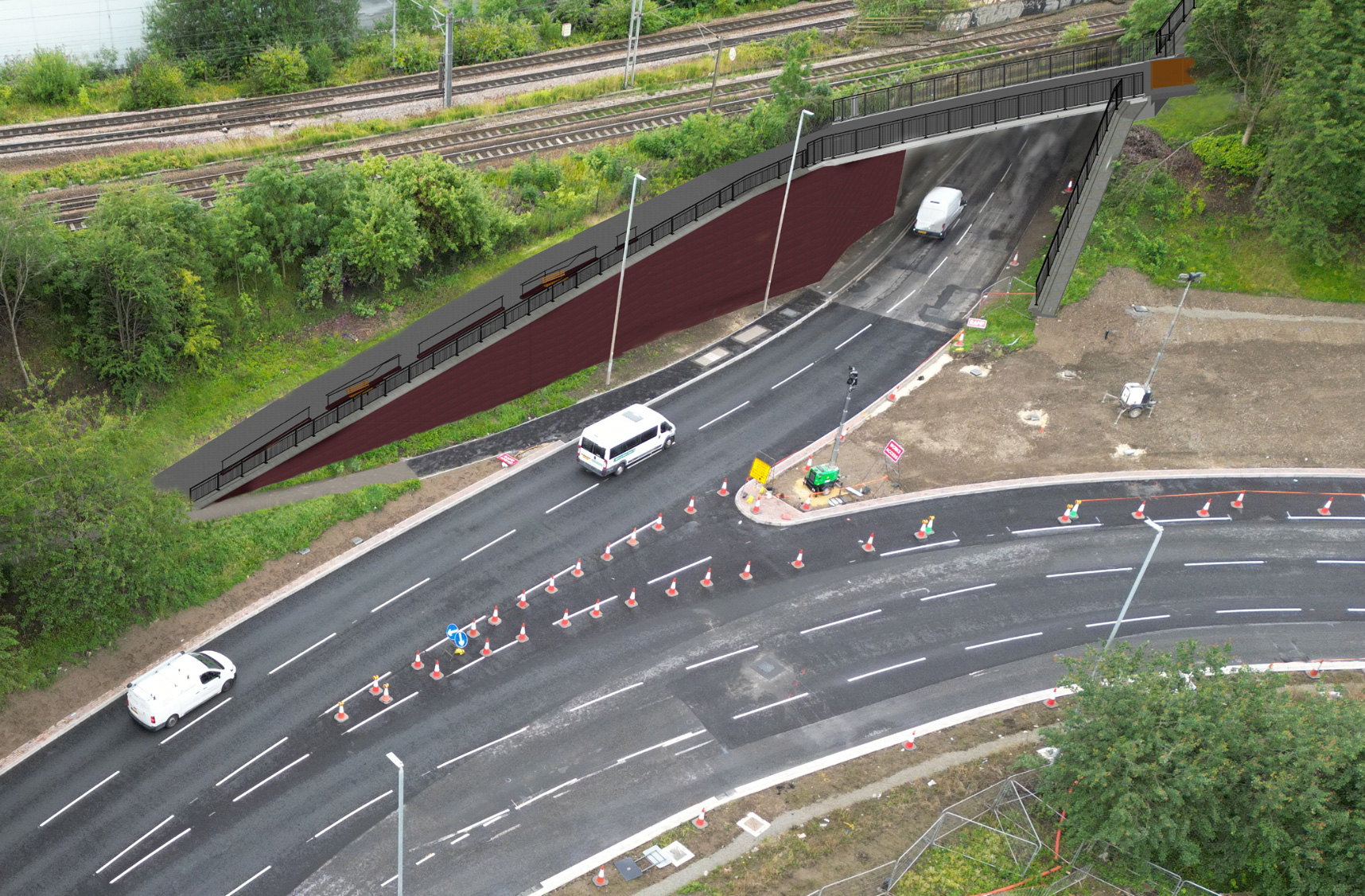 Gelderd footbridge features a single-span box beam with a length of 24.9 metres and a narrow 1.8-metre-wide footway. Access is currently gained from the east via a public footpath. In addition to expanding the space for users to a four-metre-wide footway, the eastern access to the Gelderd Road footbridge is being widened to a three-metre shared-use footpath, including provision for rest areas further contributing to improved accessibility for pedestrians and cyclists. Both bridges are designed to require minimal maintenance over the next century.