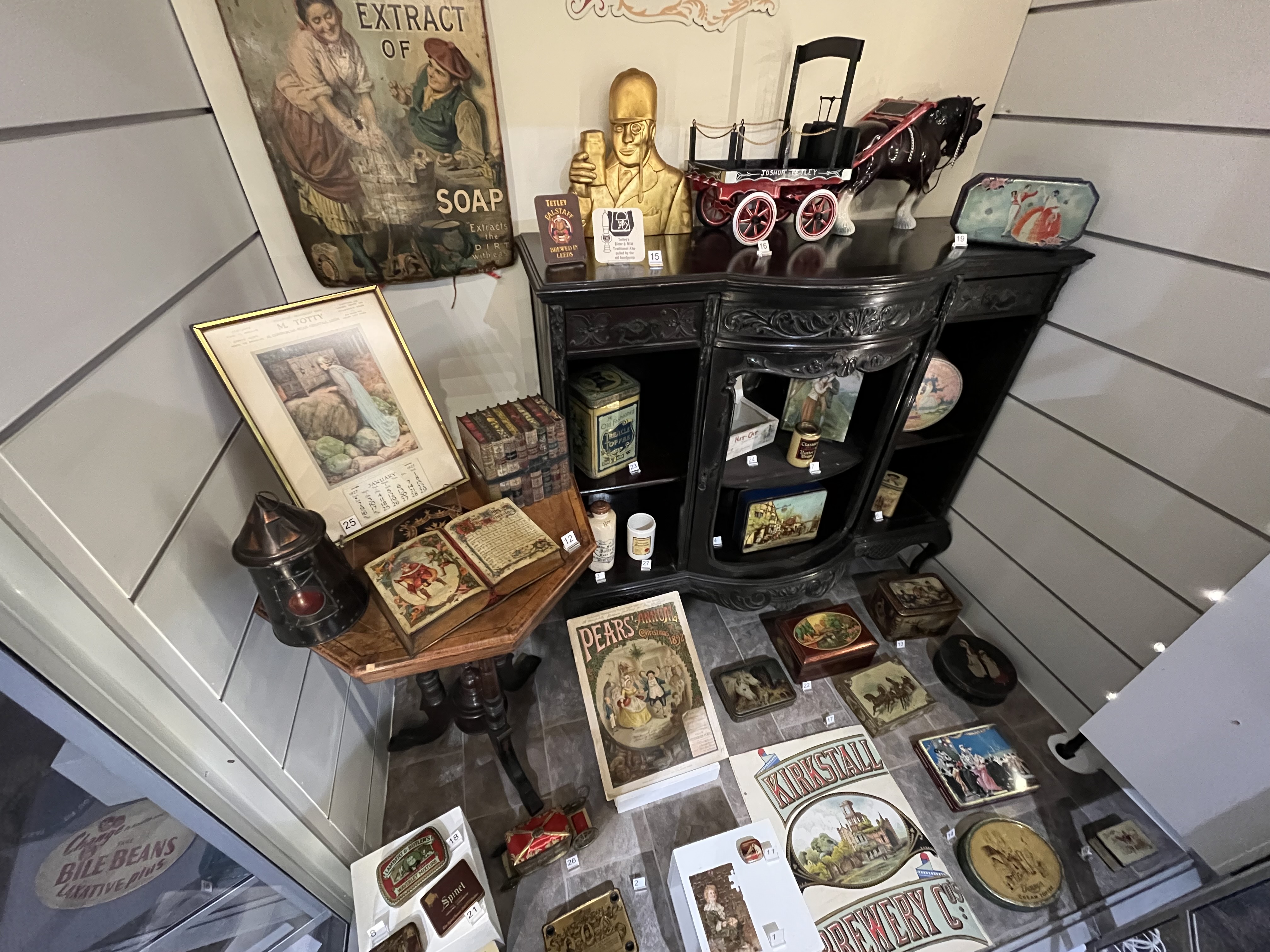 Also on display is an eye-catching golden Tetley’s brewery sign and a huge wooden arm and hammer which once advertised a Victorian gold beater’s shop in Leeds.