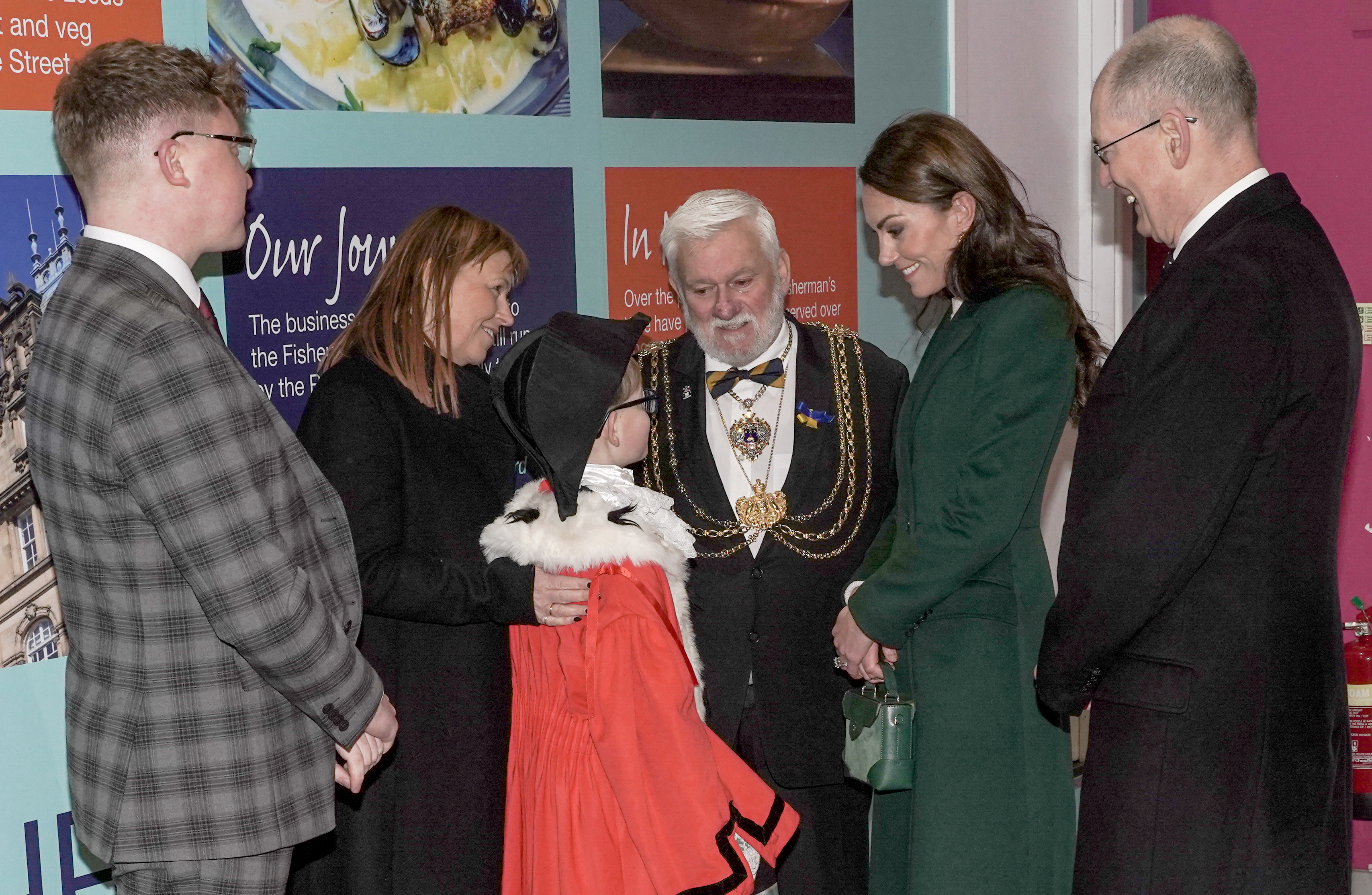 The Princess of Wales is welcomed to Leeds by the Lord Lieutenant of West Yorkshire, Ed Anderson CBE, The  Lord Mayor of Leeds, Councillor Robert W Gettings MBE JP, Mason Hicks, Children's Mayor of Leeds, and Deputy Leader of Council and Executive Member for Economy, Culture and Education, Councillor Jonathan Pryor.