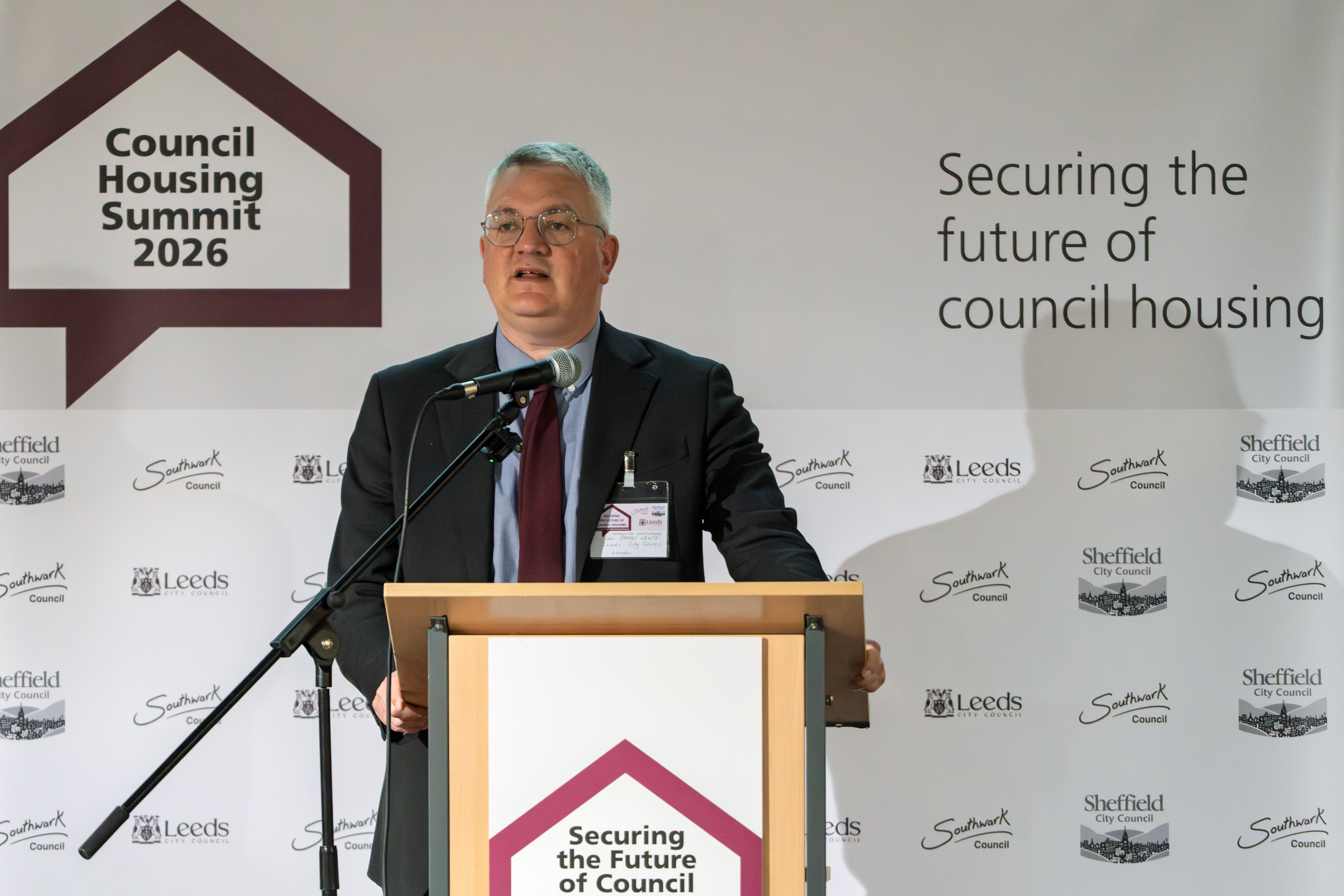 Councillor James Lewis, leader of Leeds City Council, speaking at 2026's Securing the Future of Council Housing Summit in Leeds.