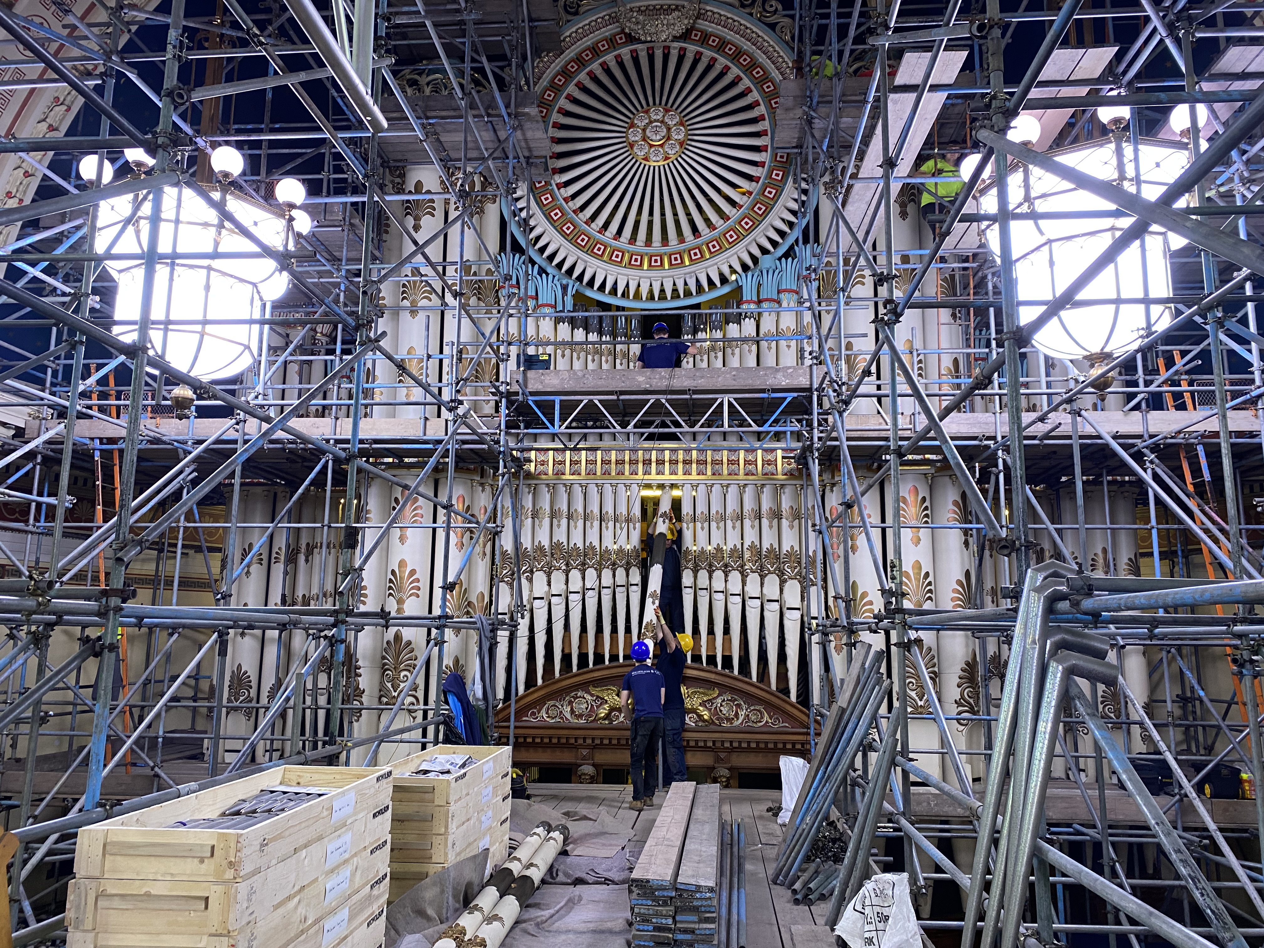 Pipe organ specialists from Nicholson and Co. Ltd set up in Leeds Town Hall's magnificent Victoria Hall this week where they began erecting a complex network of scaffolding around the 50ft high organ before getting to work on the painstaking process of dismantling its impressive pipes and intricate inner workings.