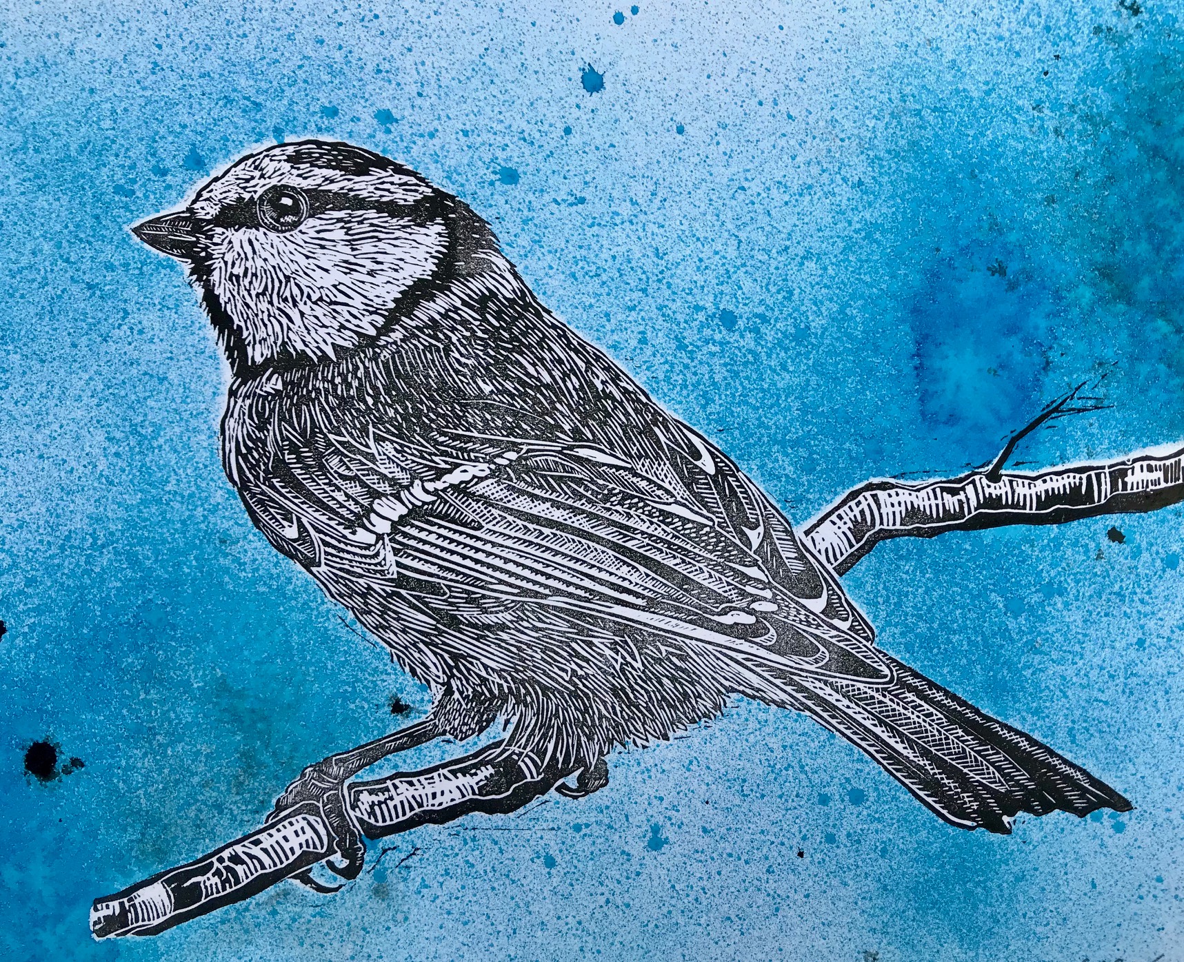 Lino print of a blue tit which is part of the art packs being sent to members of the group.