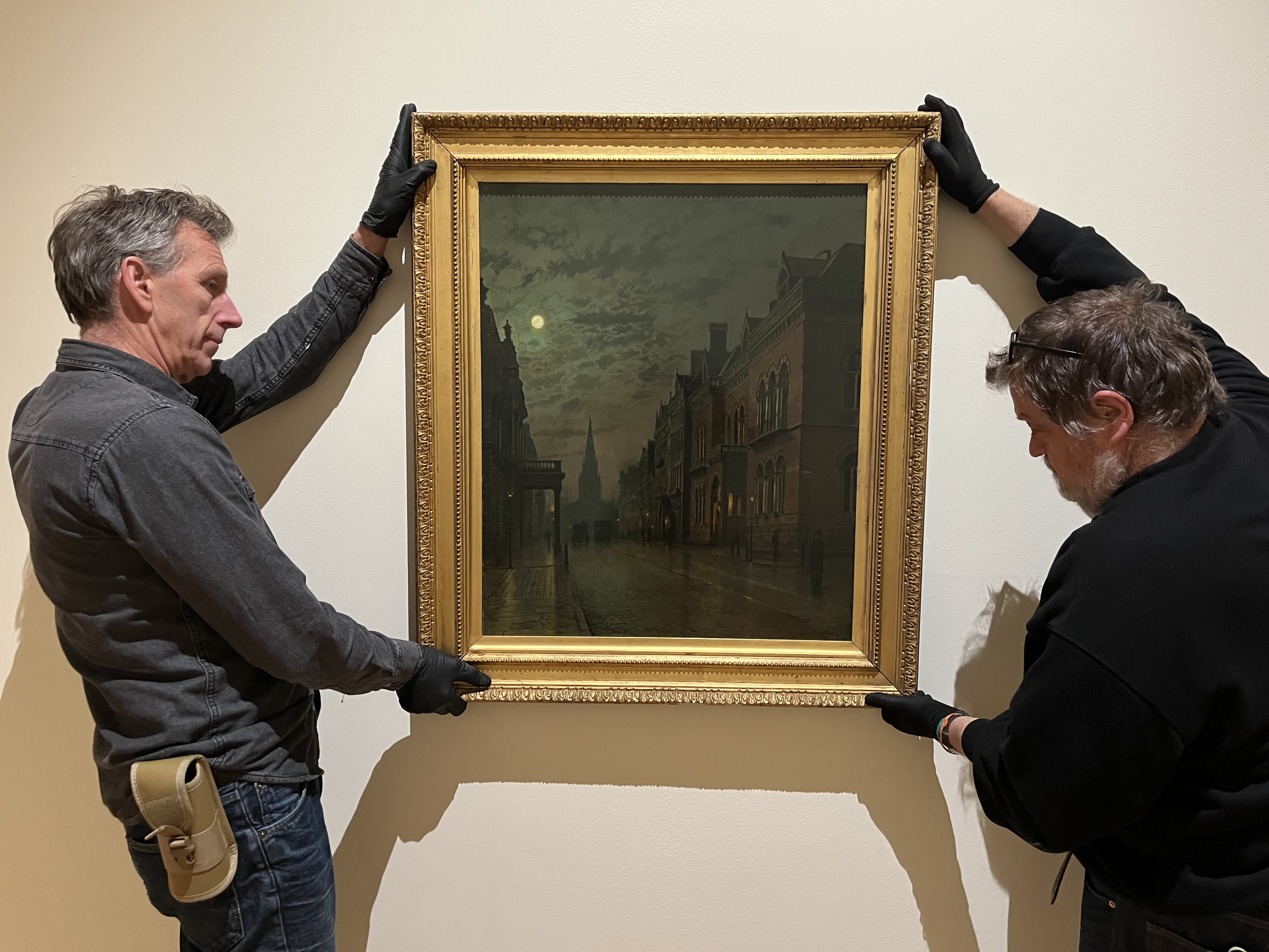 Technicians at Leeds Art Gallery hang John Atkinson Grimshaw's famous depiction of Park Row in Leeds, one of the works on display as part of Don’t Let’s Ask For the Moon: Nocturnes and Atkinson Grimshaw, which opens at Leeds Art Gallery this November 14.