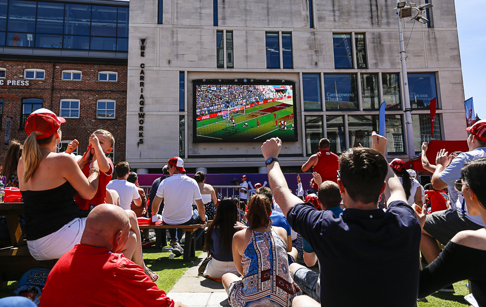 Crowd watching the England women's team in action on the big screen in Millennium Square