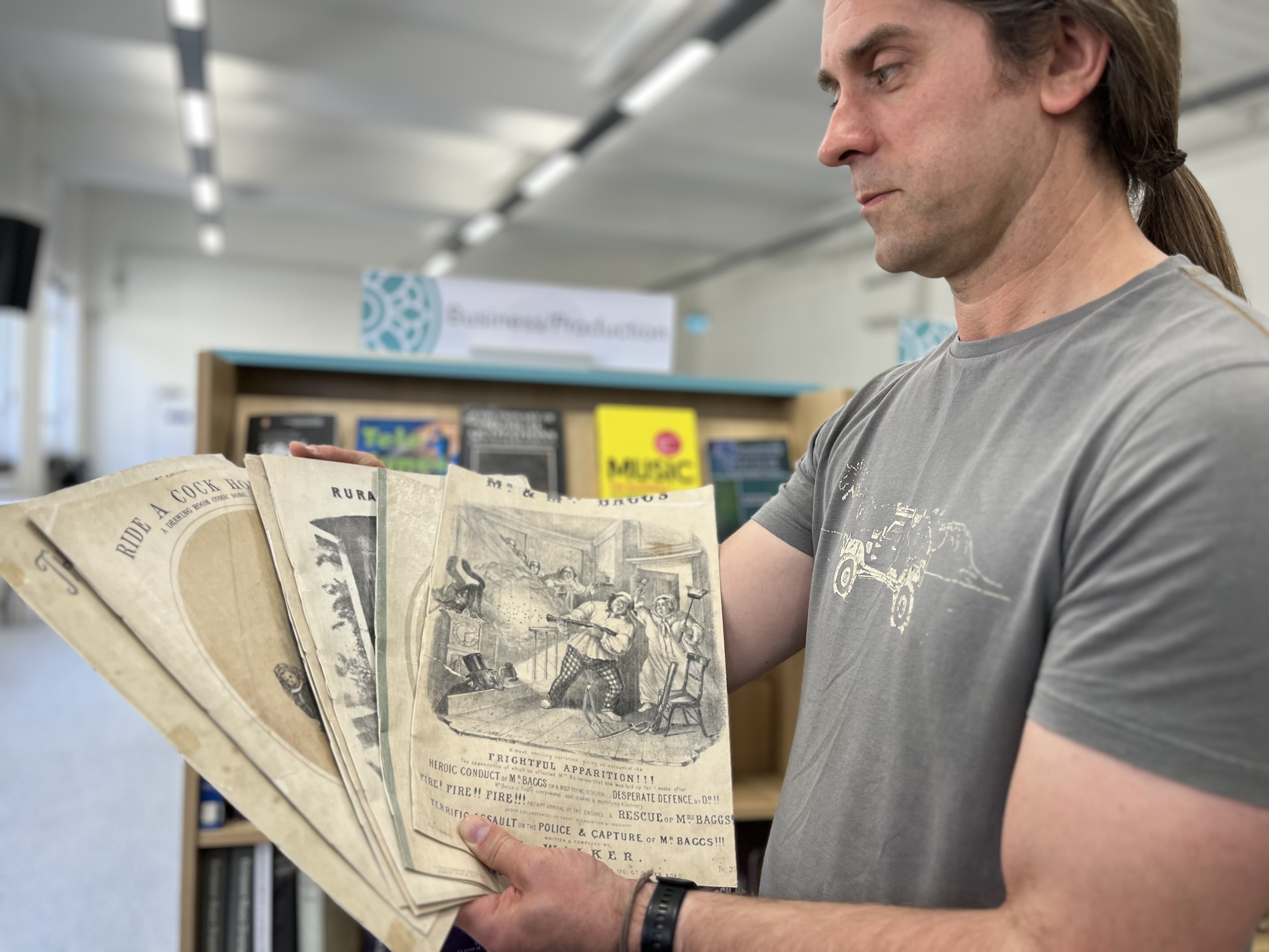 Music librarian Lee Noon is shown here with a selection of the sheet music.