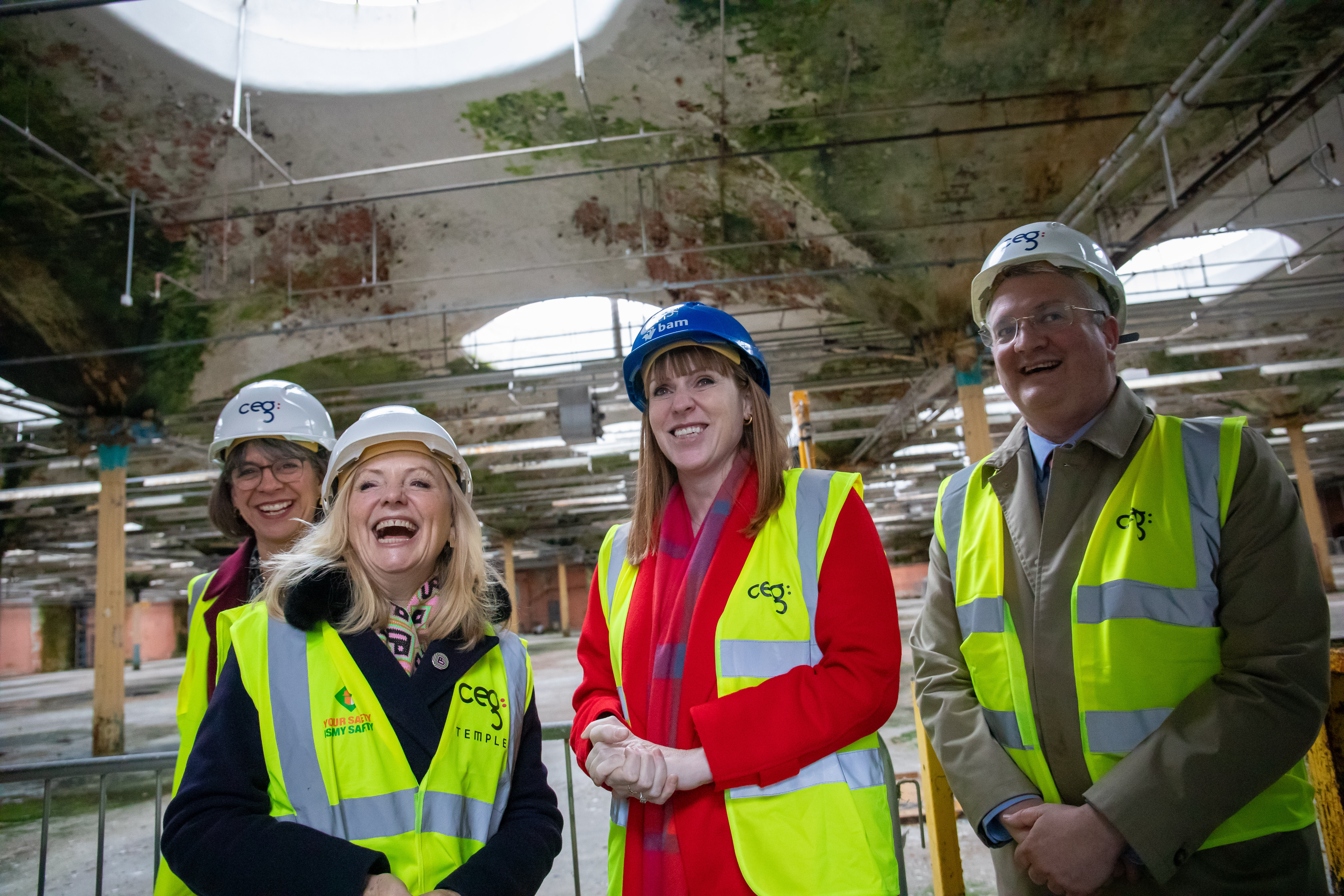Left to right: British Library chief executive Rebecca Lawrence, Mayor of West Yorkshire Tracy Brabin, Deputy Prime Minister Angela Rayner and Leeds City Council leader Councillor James Lewis visit the Temple Works site on February 13, 2025. Credit: Simon Walker/Deputy Prime Minister's Office.