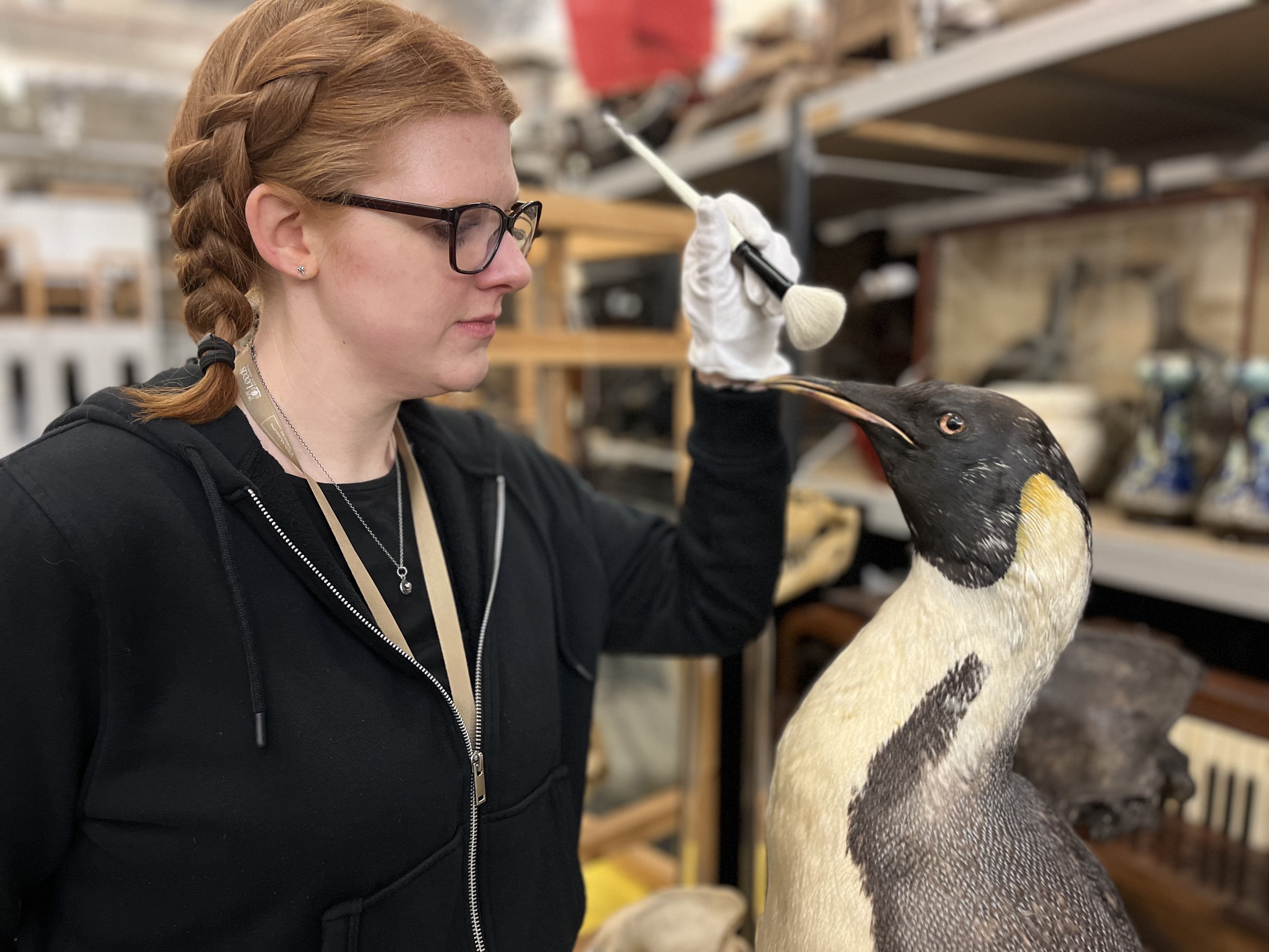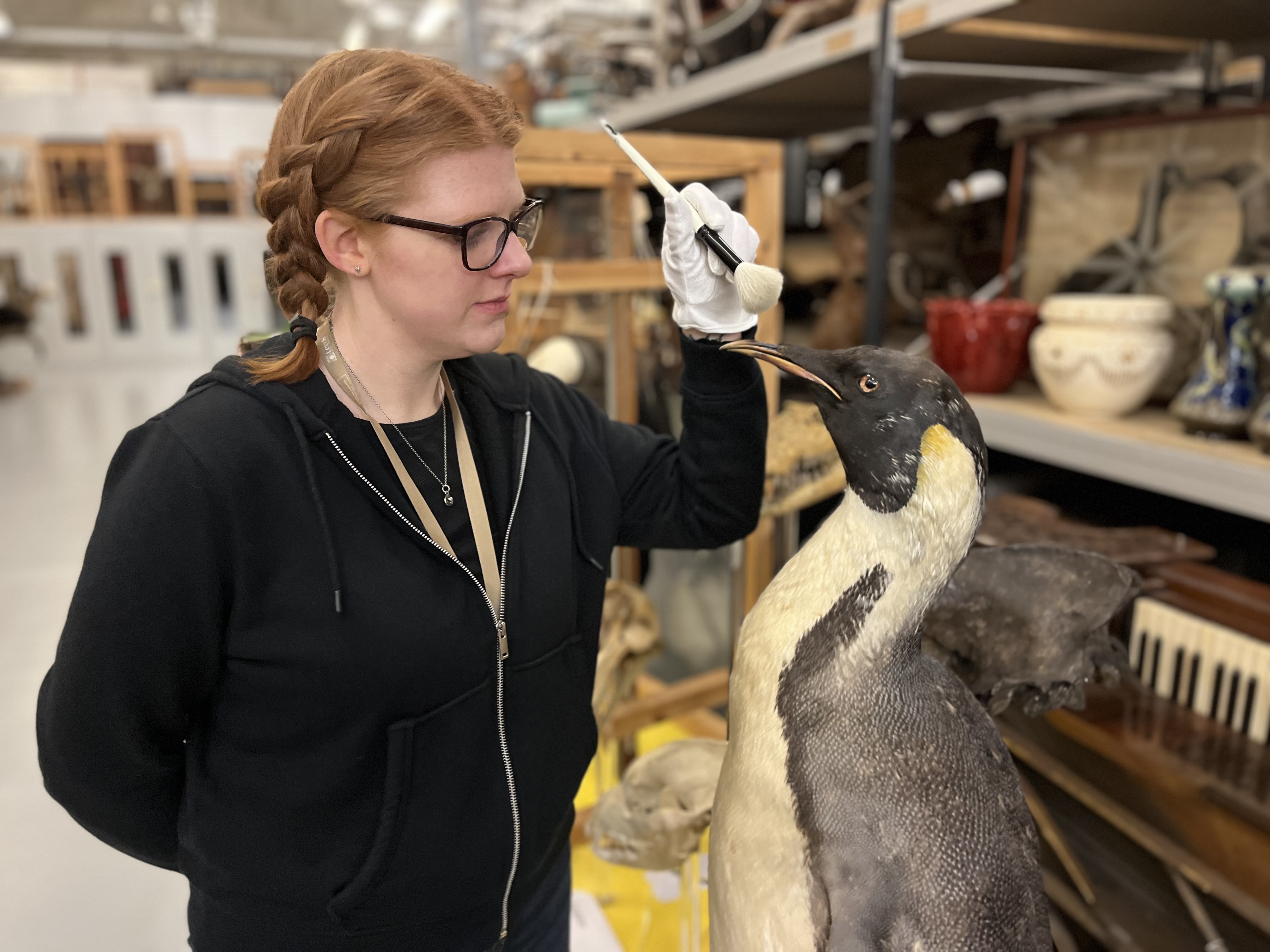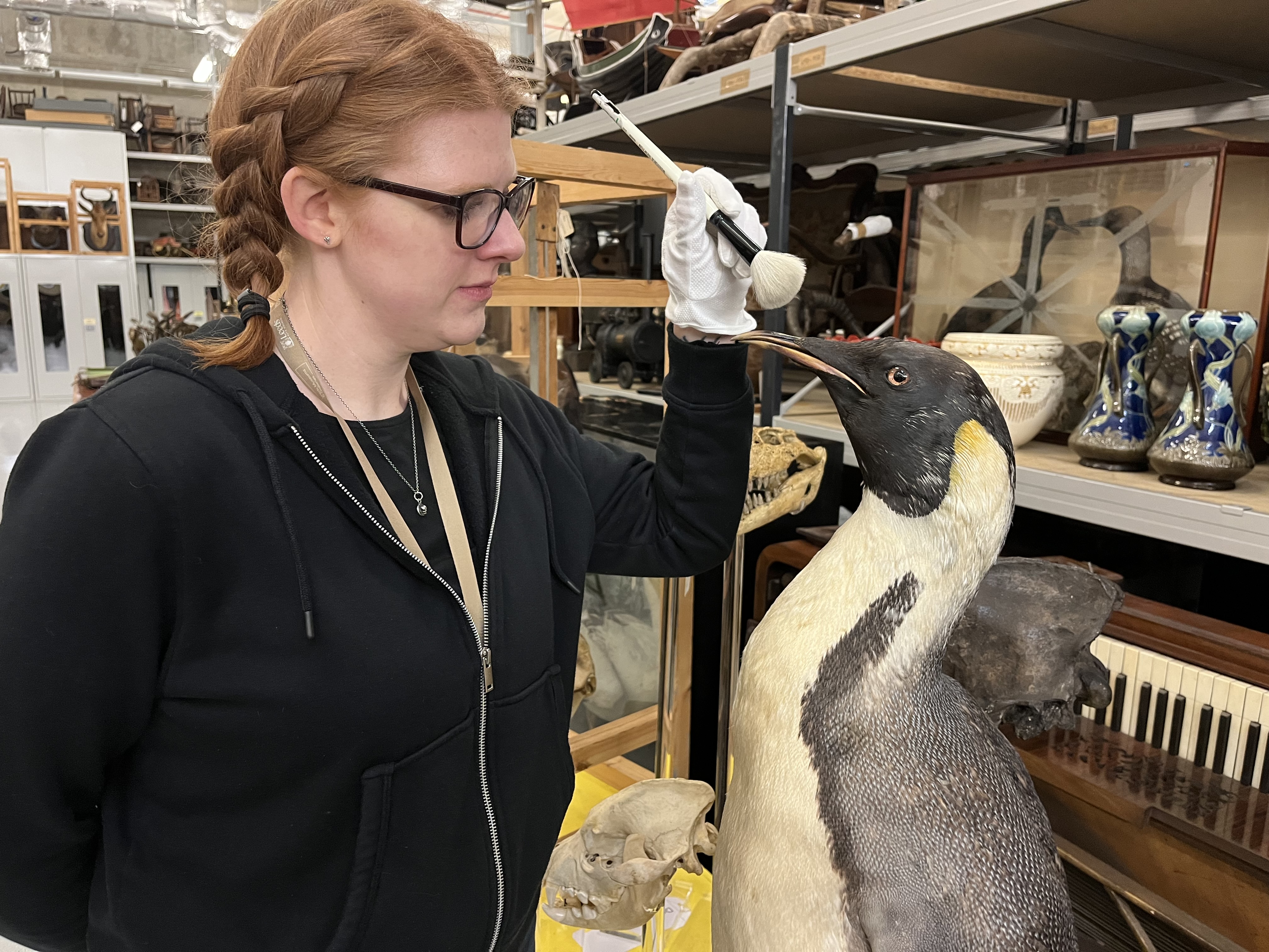 Curator Sarah Burhouse with a magnificent mounted emperor penguin, believed to have been collected during an Antarctic expedition, which was among the specimens being cared for. The penguin, which has only recently gone back on display at the centre, has been cleaned and checked for any of the pests which can cause damage to taxidermy if left unchecked.