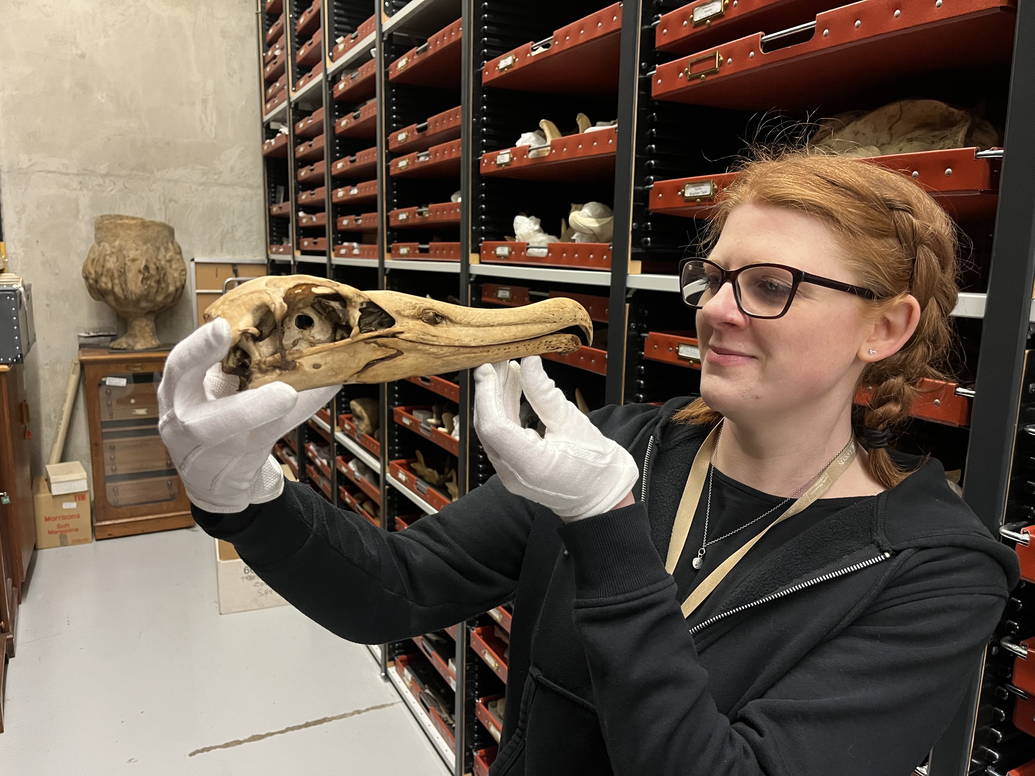 Curator of natural sciences Sarah Burhouse conserves the towering skeleton of a full grown adult ostrich, the world’s largest bird. Believed to date from around 1841, the skeleton was repositioned for display ten years ago with the help of the Leeds Philosophical and Literary Society.